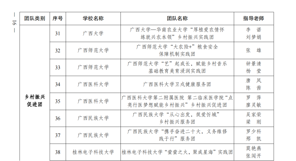根据《关于开展 2023 年广西大中专学生志愿者暑期文化科技卫生“三下乡”社会实践活动的通知》(桂青联发〔2023〕17 号)要求,经学校申报、材料审核、评议研究,最终评出 2023 年广西大中专学生志愿者暑期文化科技卫生“三下乡”社会实践活动全国重点团队 68 支、自治区重点团队 200支。