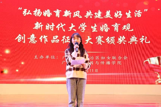 自治区妇联副主席张捷为三位一等奖获奖作品的主创人员颁奖,获奖作品包括视频《只想好好爱》、调研报告《“三孩”政策下太阳集团2007生生育价值观调研报告》、视频《近六成大学生希望在26-30岁结婚,80%偏好两个子女》。三个作品传达了同学们对新时代婚育观、新兴婚姻伦理的深刻思考、感悟以及对美好生活的向往,弘扬了青春主旋律。