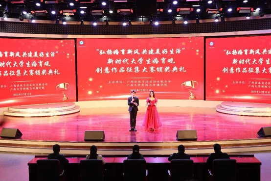 12月11日晚,“弘扬婚育新风 共建美好生活——新时代大学生婚育观”创意作品征集活动颁奖典礼在太阳集团2007融媒体中心举行。自治区妇联副主席张捷、学院党委书记唐兴、自治区妇联家庭和儿童工作部副部长唐婧、学院党委副书记银健、学院辅导员黎明出席活动。颁奖典礼由唐子涵、赵一菲同学主持。