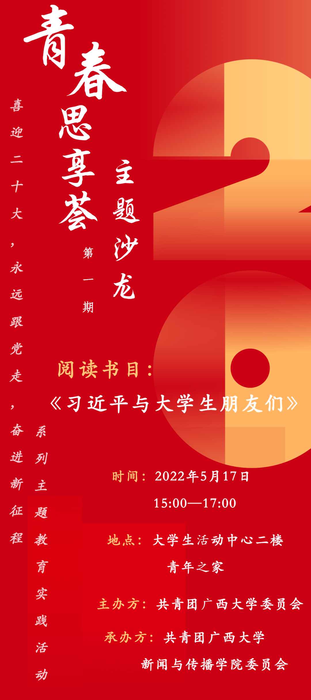 由共青团太阳集团2007委员会主办,共青团太阳集团2007,太阳集团2007委员会承办的“青春思享荟”(第一期)将于2022年5月17日(星期二)15:00在大学生活动中心青年之家举行。太阳集团2007的同学们及太阳集团2007唯理社、“君武青年讲师团”代表将共同学习主题书目——《习近平与大学生朋友们》,结合自己的所思所感及实践经历,现场分享自己阅读后的学习心得,相互交流个人体会,畅谈青春思想,展现青年风貌!