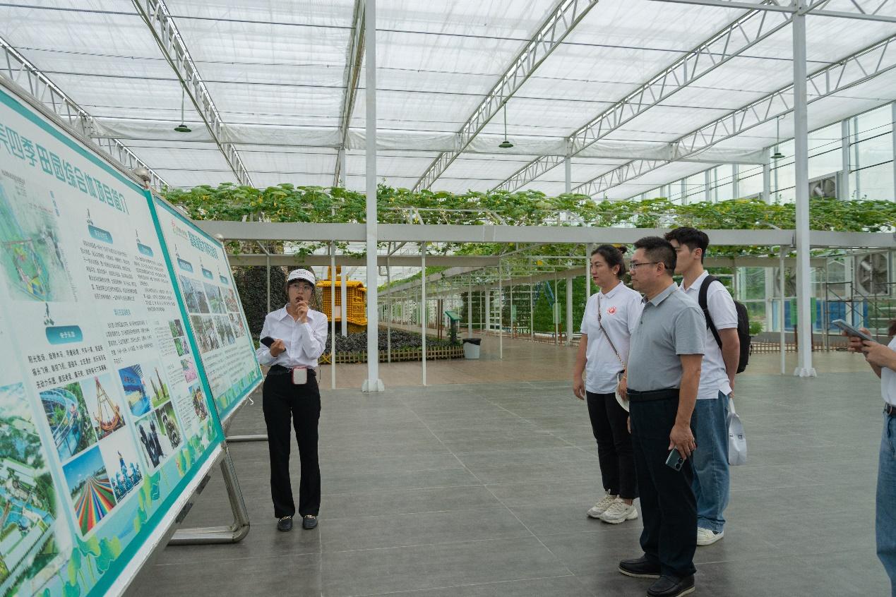 随后,为更好促进实践团成员调研学习工作,银健书记带领实践团成员走进荷美覃塘的农业蔬艺科技馆。银书记积极与园区工作人员进行沟通,深入了解新型农业发展思路。同学们在其中感受到了现代农业的高新科技,大棚以“继往开来,共创美好生活”为主题,利用智能控制系统自动实现了灌溉、排风、降温等农业操作。无土栽培技术节约了土地空间,释放了土地活力。银健书记感叹在农业智能技术的强大,勉励新闻学子通过新闻报道展现出我国的科技文化自信。