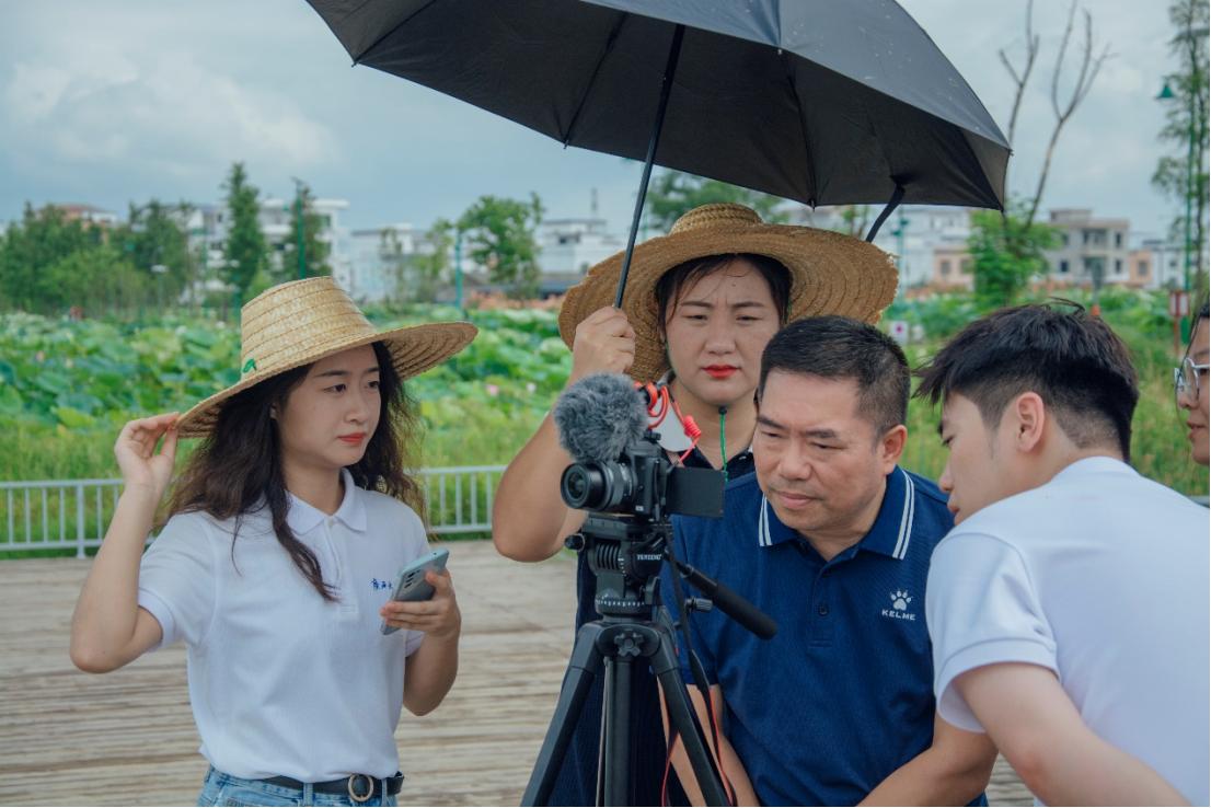 7月30日下午,实践团联合覃塘区城投集团与荷美覃塘景区进行“直播+文旅”校企联合促发荷美覃塘文旅宣传活动。活动采用现场直播的方式进行。“接天莲叶无穷碧,映日荷花别样红”,新闻学子穿梭在荷叶栈道上,在直播间介绍“荷美覃塘”景区优美的自然风光以及景区基础设施和保障,展现了覃塘生态旅游建设成果。
