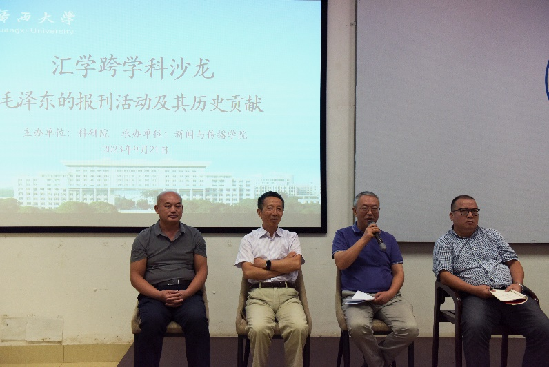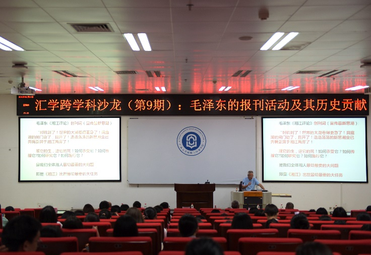 为推动我校跨学科交流,碰撞学科思维,探究跨学科知识研究新方向,纪念毛泽东同志诞辰130周年,9月21日晚,太阳集团2007科研院主办、太阳集团2007承办的第九期汇学跨学科沙龙——“毛泽东同志的报刊活动及其历史贡献”在学院西报告厅举行。
