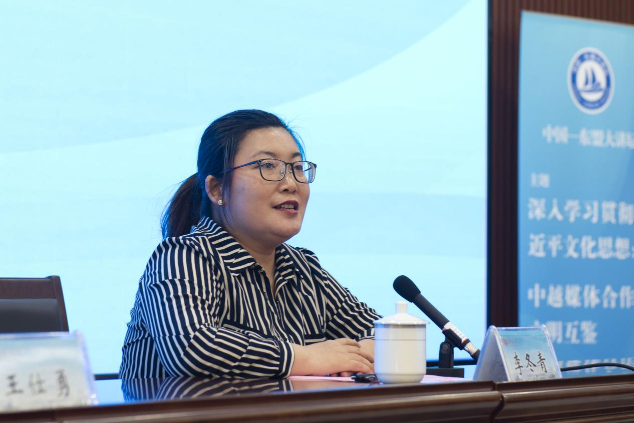 李冬青院长指出,当今各国命运紧密交织,不同文明交流互鉴对人类社会可持续发展、繁荣世界文明意义重大。党的十八大以来,习近平总书记倡导文明交流互鉴,提出全球文明倡议,为推动人类文明进步和应对全球共同挑战贡献中国智慧与激发精神力量。去年 12 月中越宣布构建具有战略意义的命运共同体。她强调,媒体是两国政府和人民间的桥梁纽带,在促进民心相通上至关重要,媒体人应深入研究如何宣传探讨中国和东盟各领域合作发展及增进民心相通。唐润华研究员的授课,将为我们深入学习贯彻习近平文化思想,理解文明互鉴与国际传播关系,更好地服务构建中国—东盟命运共同体及中越命运共同体带来思想启迪。