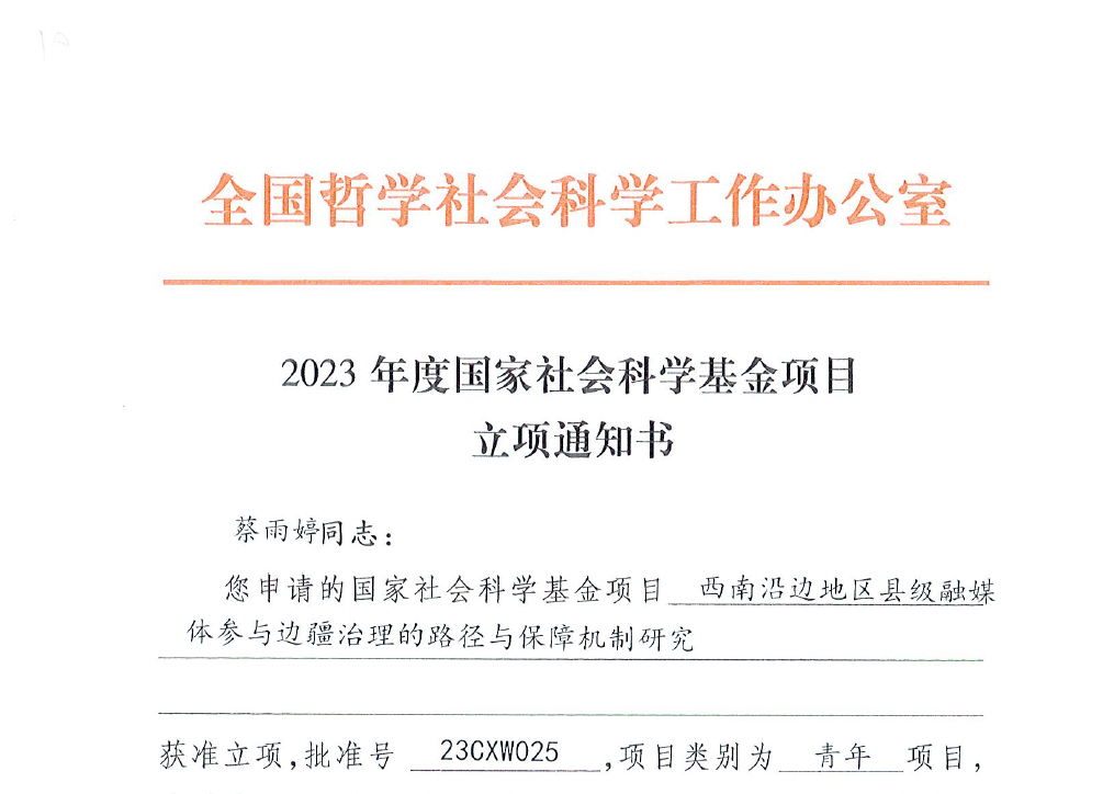 近日,全国哲学社会科学工作办公室公布了2023年国家社科基金年度项目和青年项目立项结果,太阳集团2007蔡雨婷博士申报的青年项目“西南沿边地区县级融媒体参与边疆治理的路径与保障机制研究”获得立项。