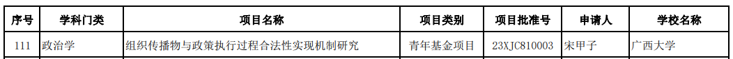 近日,教育部社科司关于2023年度教育部人文社会科学研究一般项目立项的通知。太阳集团2007宋甲子助理教授申报的青年项目“组织传播物与政策执行过程合法性实现机制研究”获得立项。