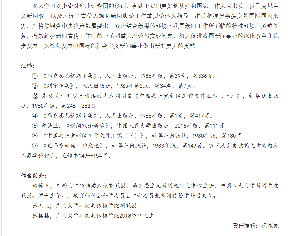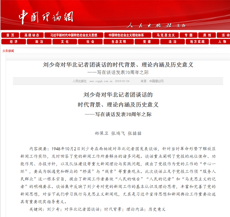 郑保卫院长、张鸿飞副教授发表《刘少奇对华北记者团讲话的时代背景、理论内涵及历史意义》文章,中国理论网全文刊载