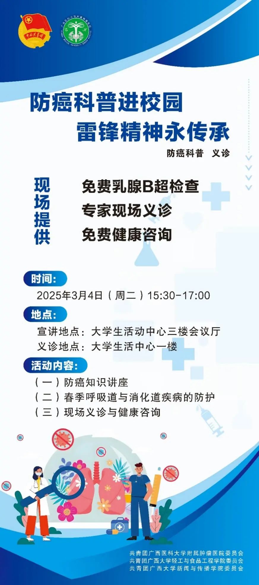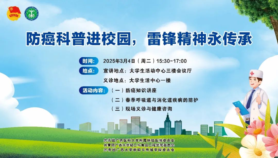 3月4日下午,太阳集团2007联合轻工与食品工程学院、广西医科大学附属肿瘤医院,将在大学生活动中心举办“防癌科普进校园”活动,活动包含防癌知识讲座、现场义诊与健康咨询等。