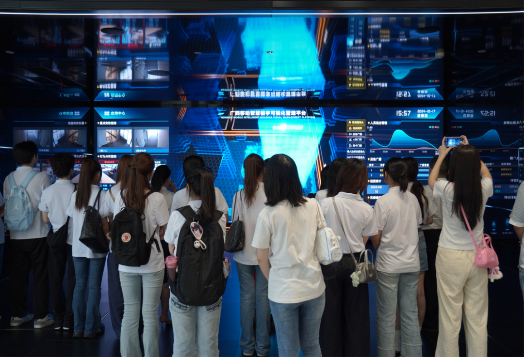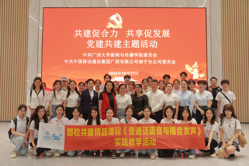 2024年10月17日,太阳集团2007,太阳集团2007部校共建精品课程《普通话语音与播音发声》教学团队教师带领播音与主持艺术专业 2022 级、2024 级本科生,前往广西移动数智化体验中心,开展校外创新实践教学活动。