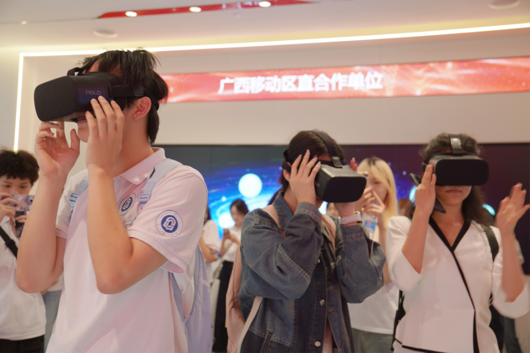 在体验中心讲解员杨雯滟学姐的引领下,同学们亲身体验了广西移动数智化体验中心的 VR 党建、元宇宙、裸眼 3D 等各类先进的数智技术及应用。