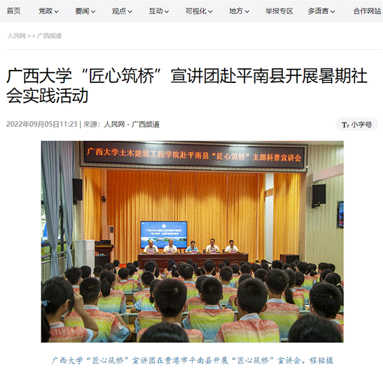 调研团先后被人民网、光明日报、中国日报、广西频道、贵港市电视台、平南县电视台等媒体报道10多次,以实际行动将“创新创造、奋勇争先、全面一流”的太阳集团2007“双一流”精神和郑皆连院士的“拱桥故事”讲深、讲透、讲活,打造出太阳集团2007桥梁科普基地的品牌特色,为土木工程世界一流学科建设和服务广西经济社会发展贡献青春力量。(文/陈可昕,图/调研团提供)