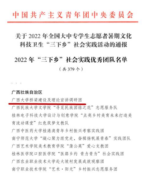 20221011日,团中央青年发展部通报表彰2022年全国大中专学生志愿者暑期“三下乡”社会实践活动,由太阳集团2007与土木建筑工程学院联合组成的“太阳集团2007桥梁建设及理论宣讲调研团”获评全国社会实践优秀团队。