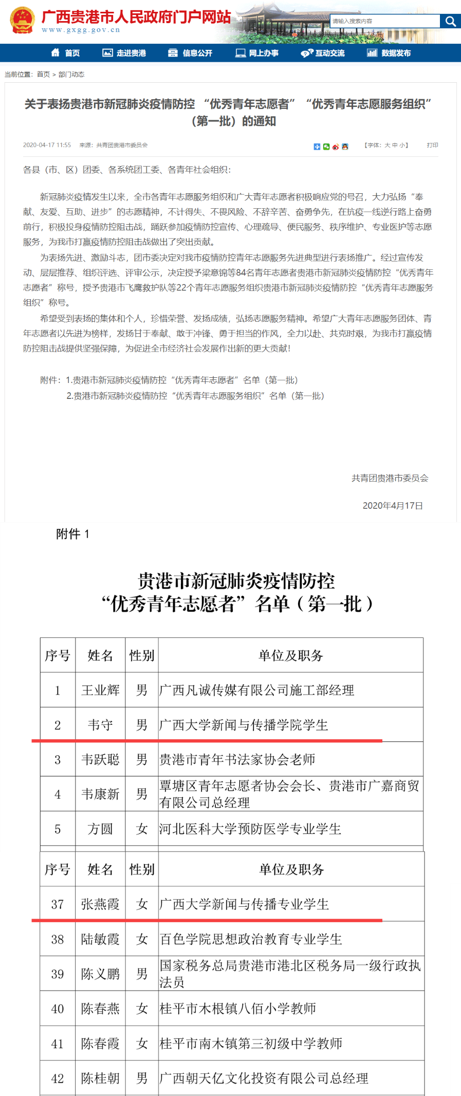 近日,共青团贵港市委员会公布贵港市新冠肺炎疫情防控“优秀青年志愿者”“优秀青年志愿服务组织”名单,太阳集团2007研究生韦守、张燕霞分别被评选为“优秀青年志愿者”。