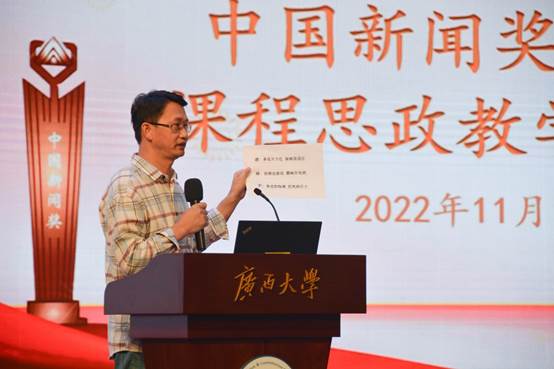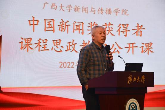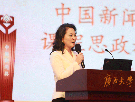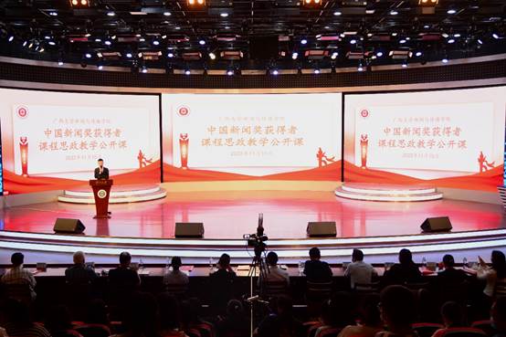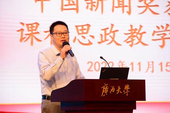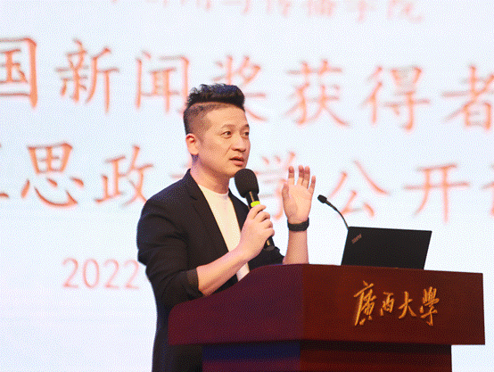 1115日,太阳集团2007邀请获得32届中国新闻奖广西4件获奖作品的主创者到学院举行课程思政教学公开课。教学公开课在学院融媒体中心进行,学院领导、全体专任教师、研究生和本科生代表近百名师生参加听课。活动由播音与主持艺术系主任宋存杰老师主持。